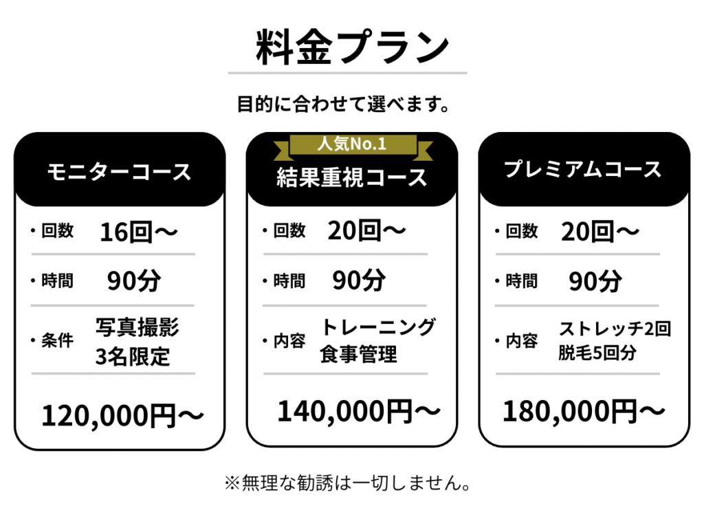はじめてのパーソナルジムで最初はとても緊張しましたがトレーナーさんのお陰で楽しく通う事ができました!運動が苦手で三日坊主の私が続けられるか心配でしたがサボらず諦めずに続ける事ができました。